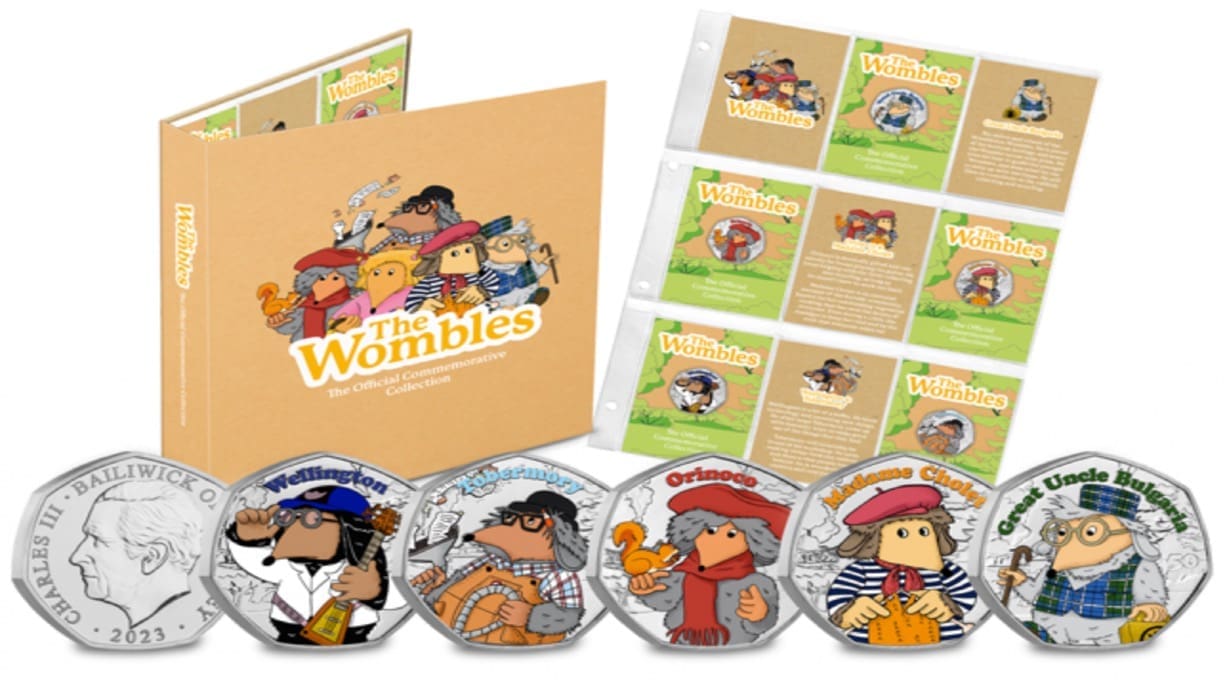 Commemorating 50 years since the Wombles’ first appearance on television, a new collector’s set of 50 pence coins has now been issued featuring full colour illustrations of five of the best-loved Wombles characters.